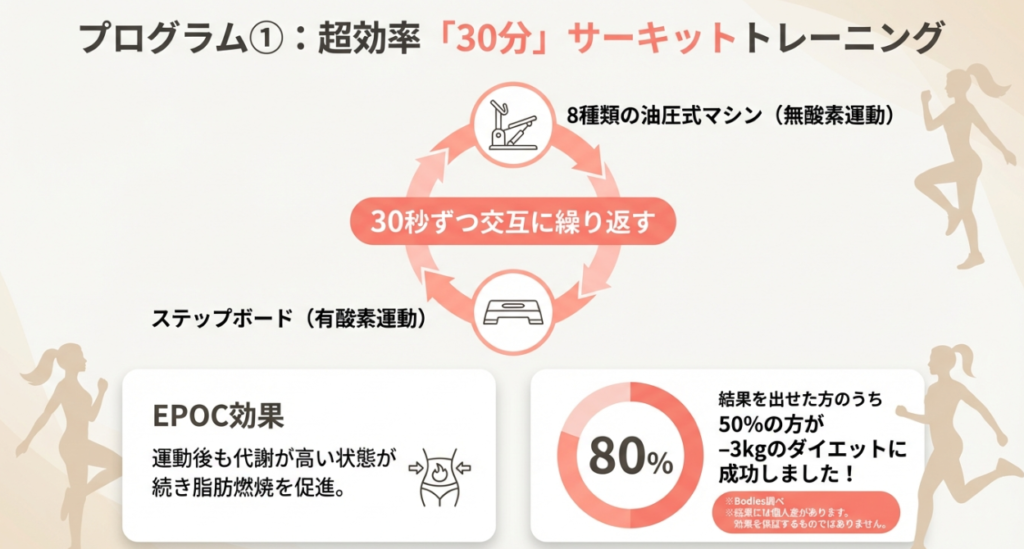 ボディーズの目玉は、なんといっても1回30分のサーキットトレーニングです。