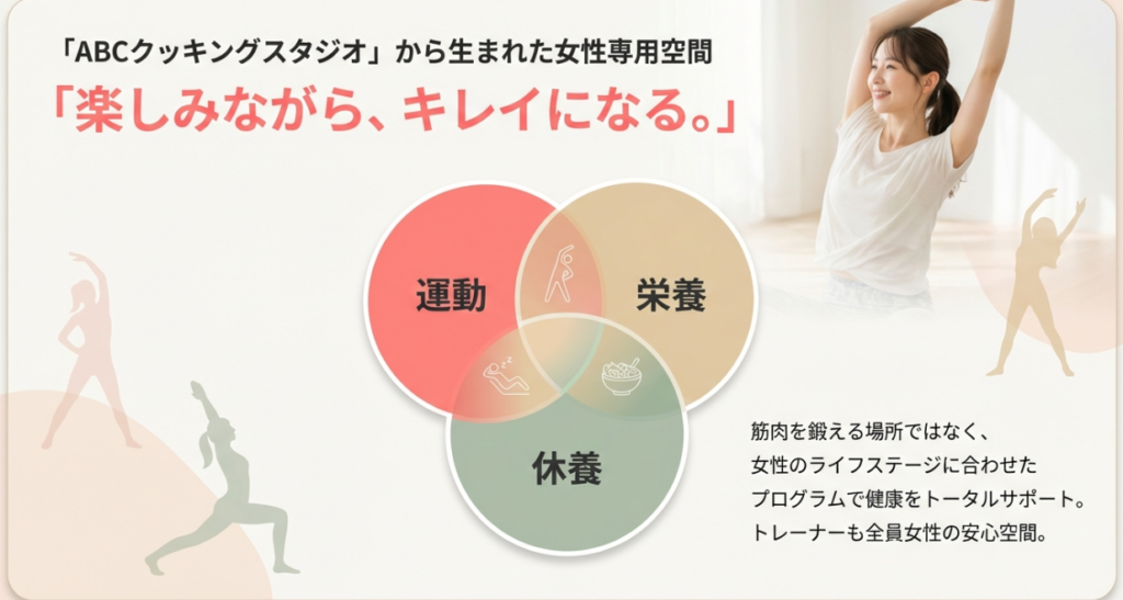 あの料理教室のABCクッキングスタジオから生まれたジムということもあり、お買い物のついでにフラッと立ち寄れる気軽さが魅力です。