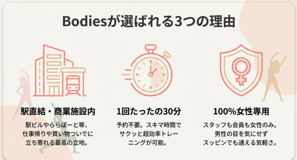 なぜなら、ボディーズは「通いやすさ」に特化しているため、過剰な設備を省いて月会費を安く抑えているからです。