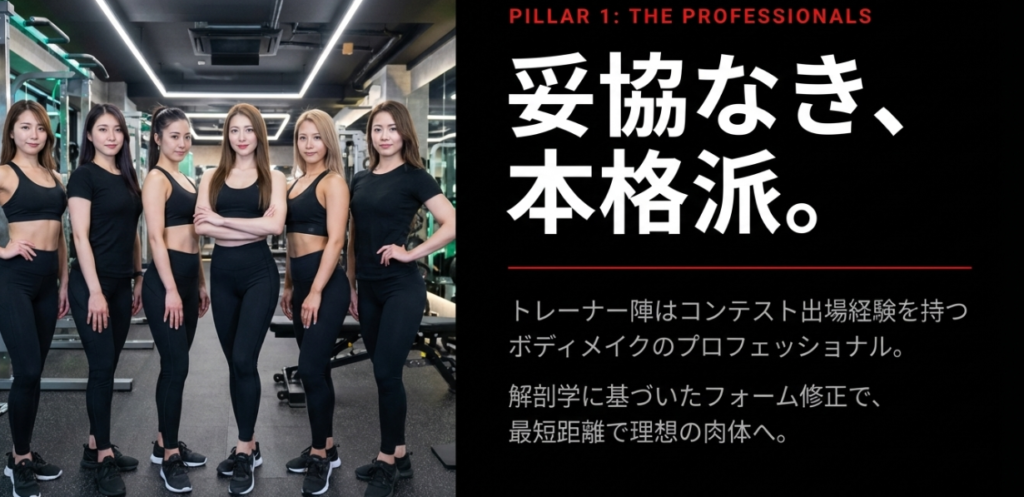 なぜなら、プロの美人トレーナーによる本格的なボディメイク指導と、モチベーションを極限まで高めてくれる極上の環境が完璧に揃っているからです。
