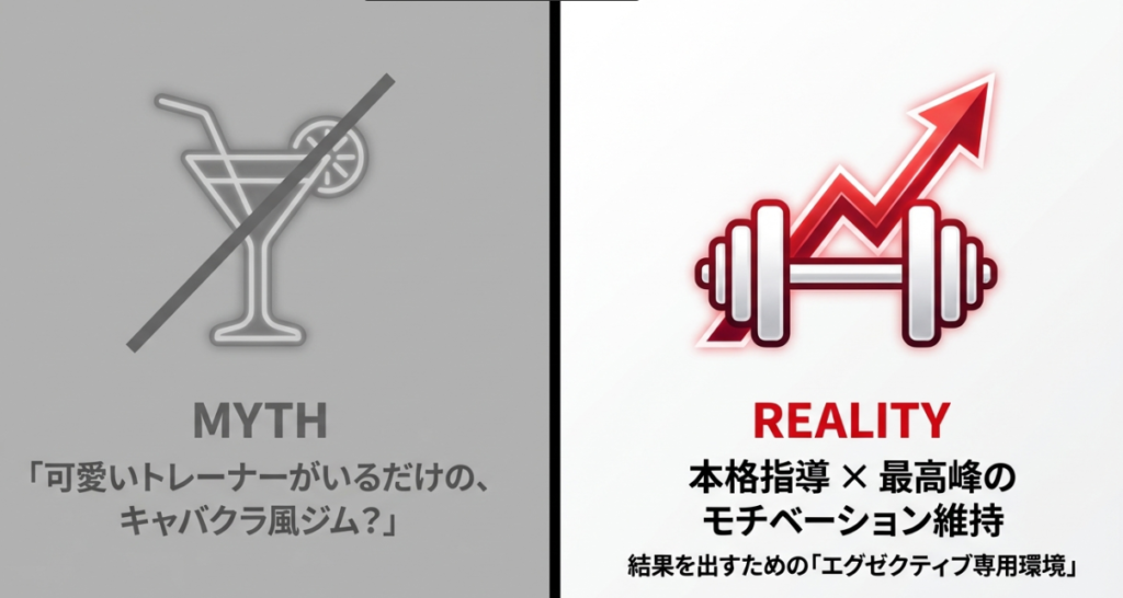 「キャバクラみたいで怪しい」という噂は単なる誤解であり、実際は結果にコミットできる真面目なパーソナルジムです。