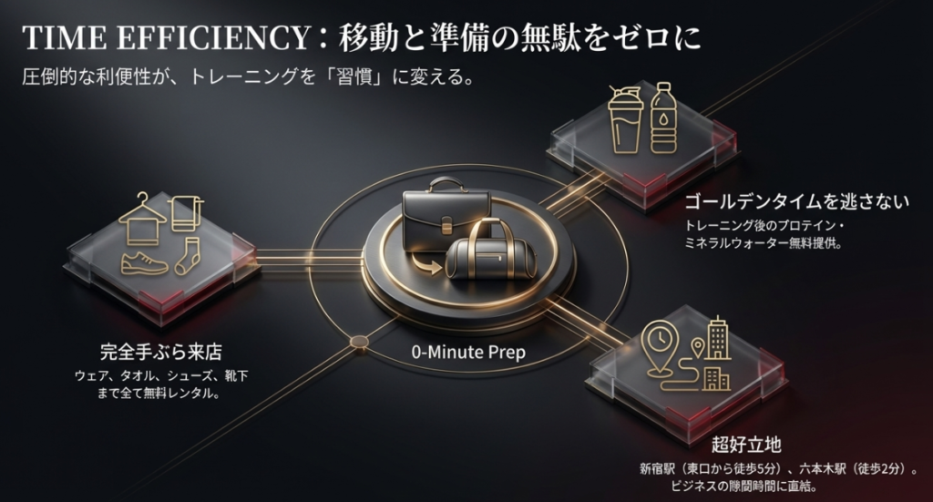 | 通いやすさ | 新宿・六本木から駅チカで完全手ぶらOK |