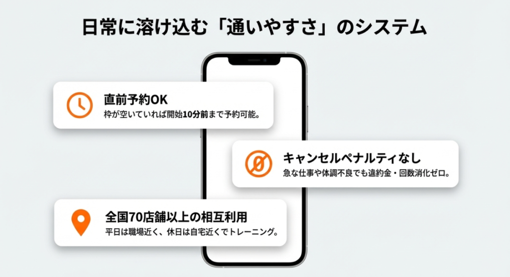 一般的なパーソナルジムとは違い、当日キャンセル無料の仕組みや全国の他店舗利用ができる制度があるからです。