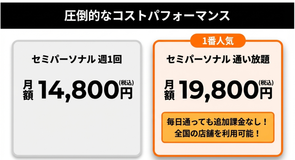 特に人気なのが「セミパーソナル通い放題プラン」で、毎月19,800円で何度でもジムに通うことができます。