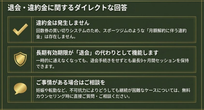 | 退会時の違約金 | 1〜2万円程度かかることも | 一切なし(0円) |
