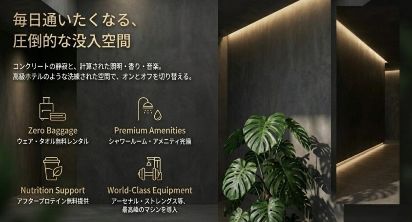 手ぶらで通えるウェアやタオルの無料レンタル、トレーニング後のアフタープロテイン、さらには高級ホテルのようなラグジュアリーなラウンジの利用まですべてが月会費に含まれています 。
