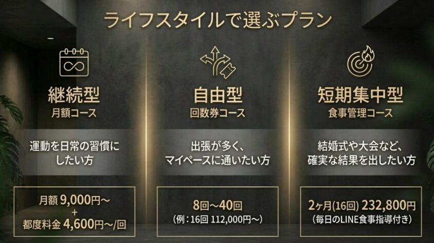 結論からお伝えすると、レクサーパーソナルジム 料金プランは「月額コース」「回数券コース」「食事管理コース」の3つがあり、今の生活スタイルに合わせて最適なものを選ぶことが最も重要です 。